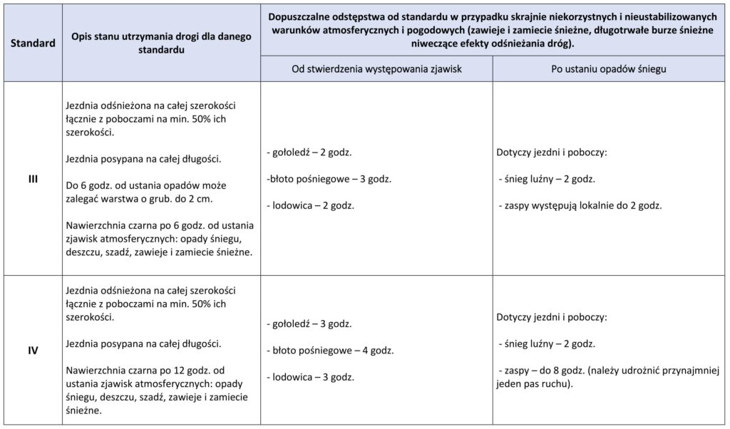 1. Zimowym utrzymaniem zostało objęte 456,80 km dróg powiatowych i realizowane będzie w dwóch standardach: III – 74,67 km i IV – 382,13 km. zgodnie ze standardami określonymi poniżej:
